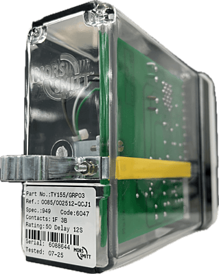 The TY155/GRP03 is a 1F 3B non-safety 12 second time delay relay unit for use in point control circuits operating a point contactor relay to BR943. The contacts within this relay unit are rated to carry no more than 300 mA. It is used to disconnect the BR943 relay coil if the latter is not otherwise de-energised, within a predetermined time. The time delay provided is sufficient to allow the point machine to complete its normal operation. Of compact modular plug-in design, it is equipped with a safety interlocking system (pin code) for insertion into mating plugboards.
