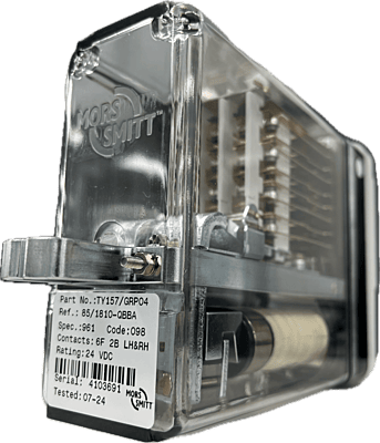 The TY157/GRP04 is a Twin 6F 2B AC Immune DC Biased Line Relay for general railway trackside signalling applications where special characteristics such as slow release etc. are not required. Twin relays consist of two relays which in effect are electrically and mechanically independent, housed in a single enclosure to the dimensions of a single relay to BR930. Of compact modular plug-in design it has non-weld contacts and is equipped with a safety interlocking system (pin code) for insertion into mating plugboards.