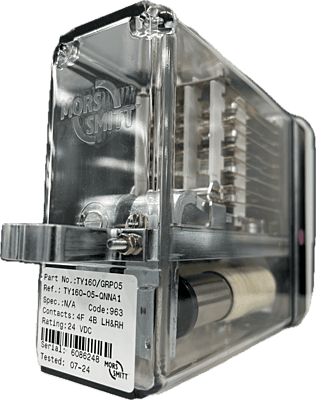 The TY160/GRP05 is a Twin 4F 4B AC Immune DC neutral line relay for general railway trackside signalling applications where special characteristics such as slow release etc. are not required. Twin relays consist of two relays which in effect are electrically and mechanically independent, housed in a single enclosure to the dimensions of a single relay to BR930. Of compact modular plug-in design, it has non-weld contacts and is equipped with a safety interlocking system (pin code) for insertion into mating plugboards.