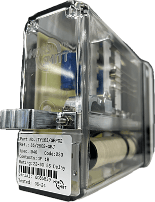 The TY163/GRP02 is a 1F 1B relay for use where a 5 second time delay is required upon de-energisation which is in excess of that obtainable conveniently from a relay with a slugged iron circuit. The time delay is achieved via a resistor/capacitor circuit. The delay is not adjustable. Of compact modular plug-in design it has non-weld contacts and is equipped with a safety interlocking system (pin code) for insertion into mating plugboards.