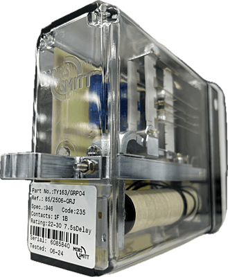 The TY163/GRP04 is a 1F 1B relay for use where a 7.5 second time delay is required upon de-energisation which is in excess of that obtainable conveniently from a relay with a slugged iron circuit. The time delay is achieved via a resistor/capacitor circuit. The delay is not adjustable. Of compact modular plug-in design it has non-weld contacts and is equipped with a safety interlocking system (pin code) for insertion into mating plugboards.