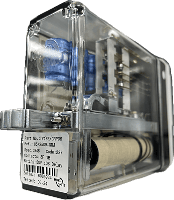 The TY163/GRP06 is a 3F 1B relay for use where a 10 second time delay is required upon de-energisation which is in excess of that obtainable conveniently from a relay with a slugged iron circuit. The time delay is achieved via a resistor/capacitor circuit. The delay is not adjustable. Of compact modular plug-in design it has non-weld contacts and is equipped with a safety interlocking system (pin code) for insertion into mating plugboards.